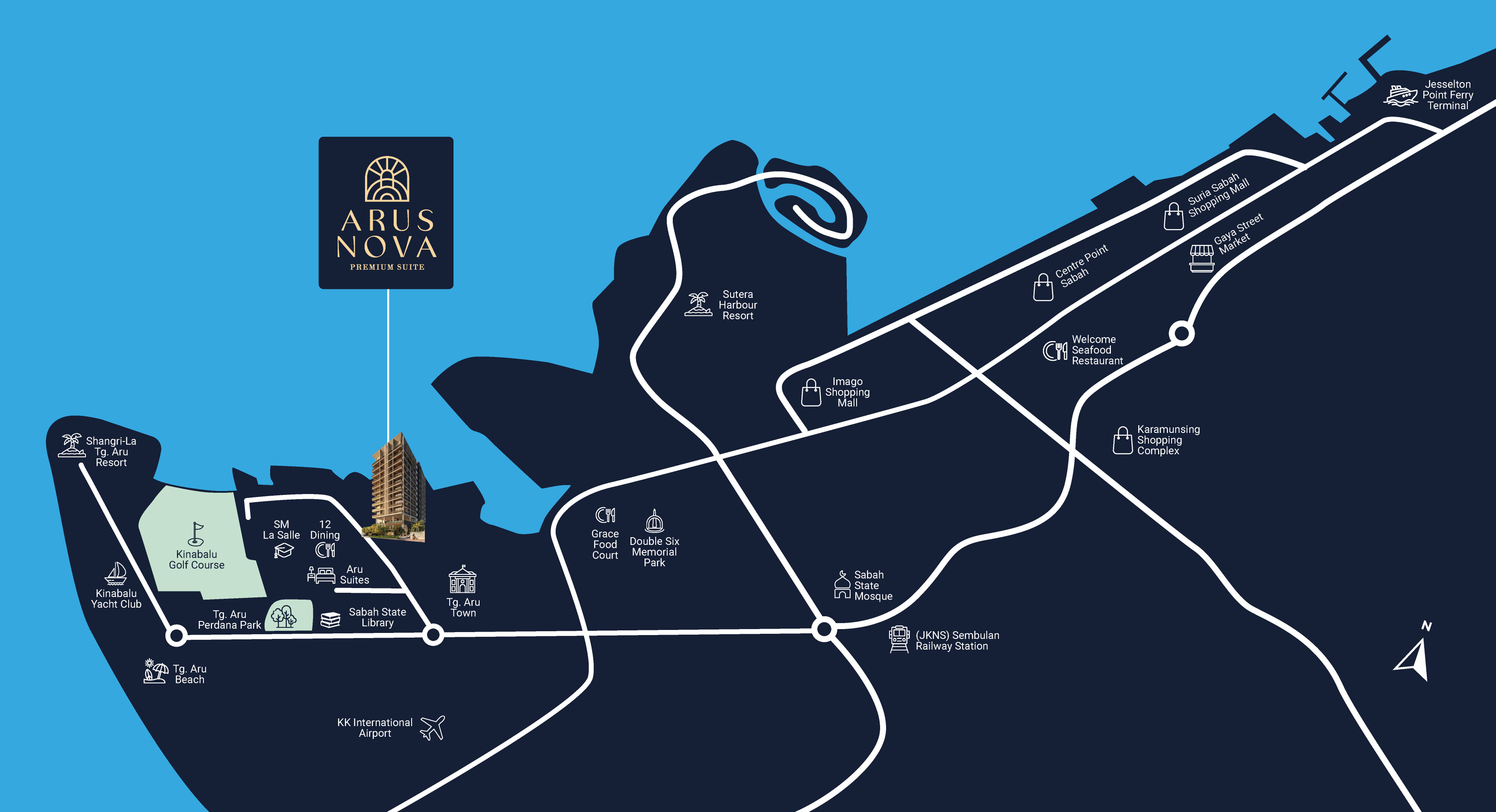Just a few minutes from Tanjung Aru Beach and KKIA, Arus Nova sits in a beachside district where coastal calm meets urban convenience.